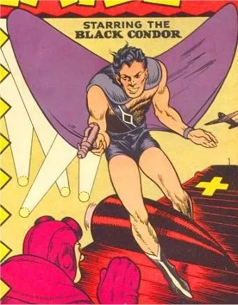 Black Condor, who premiered in Crack Comics #1 in 1940. An orphaned son of archaeologists who learned how to fly after being raised by giant condors in….Mongolia? (He was eventually absorbed into the DC Universe, and this fantastic backstory was dropped.)