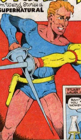 Stuart Taylor, first appearing in Jumbo Comics #1 in 1938. No nom de plume for this swash-buckling, time-traveling scientist's assistant, who honed his brawling and sword-fighting skills in combat across centuries. An early Jack Kirby creation demonstrating his taste for the fantastic, that would revolutionize comics decades later.
