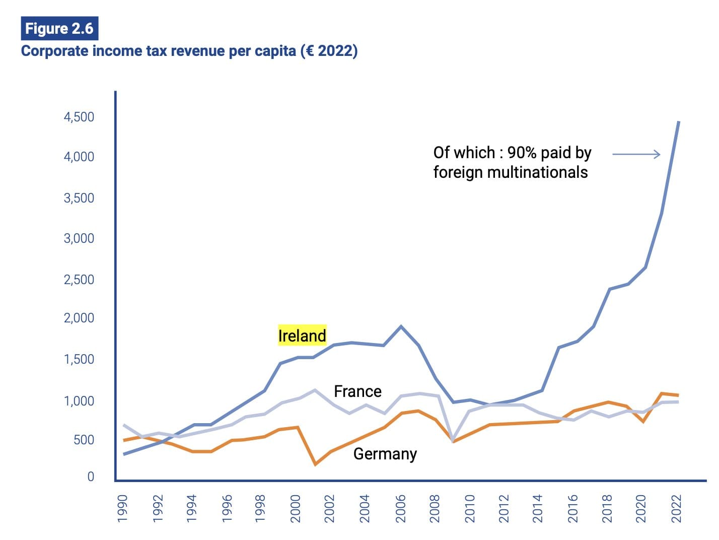So perhaps it’s not too surprising that the country’s tax revenue continues to go up, despite international efforts to clamp down on the very practices that Ireland pioneered and came to be identified with. A recent report from the European Tax Observatory, a think tank sponsored by the EC, singled out Ireland and the Netherlands as jurisdictions which received $140 billion in shifted profits in “recent years.” According to a chart from the report, Ireland's per-capita corporate income has increased exponentially in the years since it closed off the infamous Double Irish structure, and since the reforms from the Organization for Economic Cooperation and Development and the 2017 Tax Cuts and Jobs Act took effect.