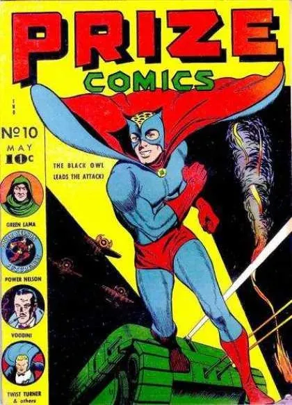 The Black Owl, appearing first in Prize Comics #1 in 1940. No particular origin story for this one, he was just a wealthy playboy he created a costume to fight crime, first as "K the Unknown" and then the Black Owl. He would eventually pass off the mask to a new hero, who mostly fought Nazis overseas.